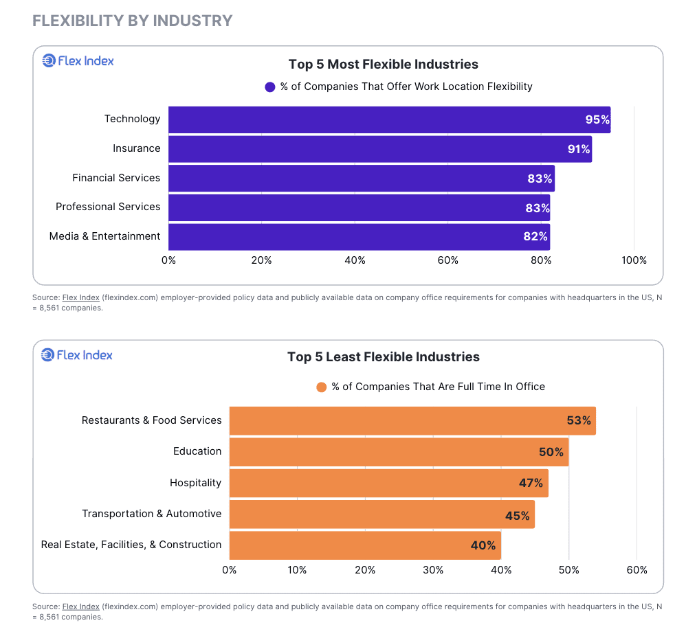 • 95% of technology companies, and over 80% of financial and professional services firms, offer location flexibility.