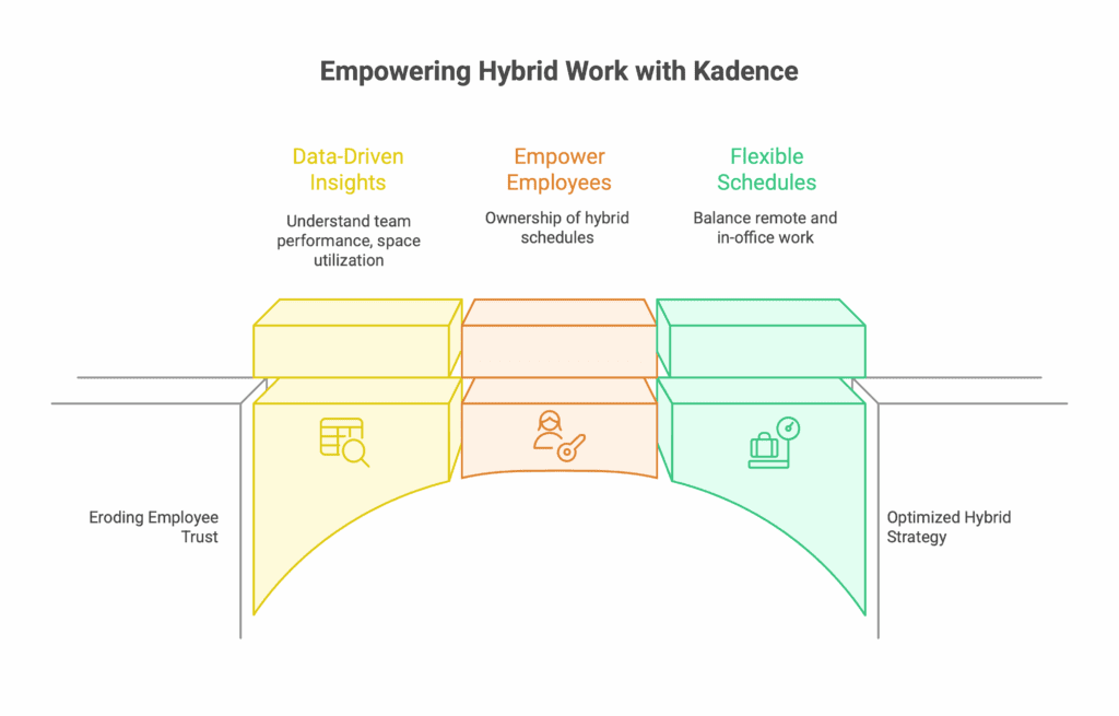 Instead of implementing rigid mandates, companies should look at solutions like Kadence Sense, which provide the insights needed to manage hybrid work without eroding trust. Kadence allows businesses to empower employees to take ownership of their hybrid schedules, all while giving managers the tools to make data-backed decisions that benefit both the company and its people.